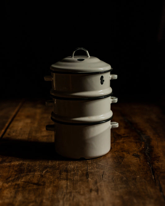 Juego vintage de utensilios de cocina esmaltados apilables de los años 50